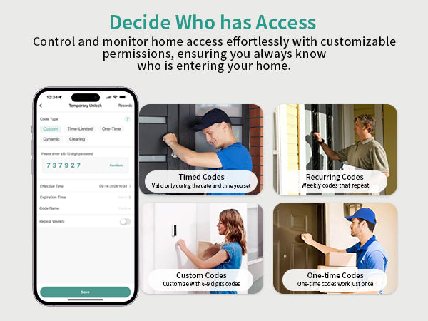 Take full control of your home’s security with customizable access permissions. Assign unique fingerprints or passcodes to family members, guests, or service providers, and monitor entry logs in real time to always know who is coming and going.