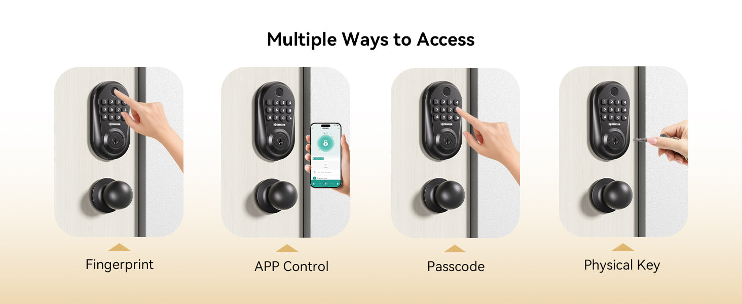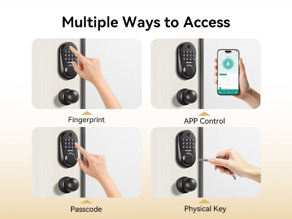 - 6-in-1 Smart Access & Classic Knob Style: Experience ultimate convenience with six entry methods: fingerprint, keypad PIN, Bluetooth App control, IC card, mechanical key, and temporary guest codes. The classic knob handle design complements most residential doors, seamlessly blending advanced technology with timeless style for your entryway.
