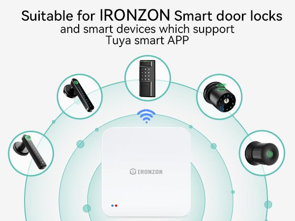 The IRONZON Smart Gateway is designed to seamlessly connect with IRONZON smart door locks and other smart devices that support the Tuya Smart App. By integrating this gateway, you can unlock remote access, real-time monitoring, and enhanced security features. Whether you're at home or away, enjoy full control over your smart locks through the app, receive instant notifications, and manage access permissions with ease. Upgrade your smart home experience with the IRONZON Smart Gateway for convenience, reliability, and peace of mind.